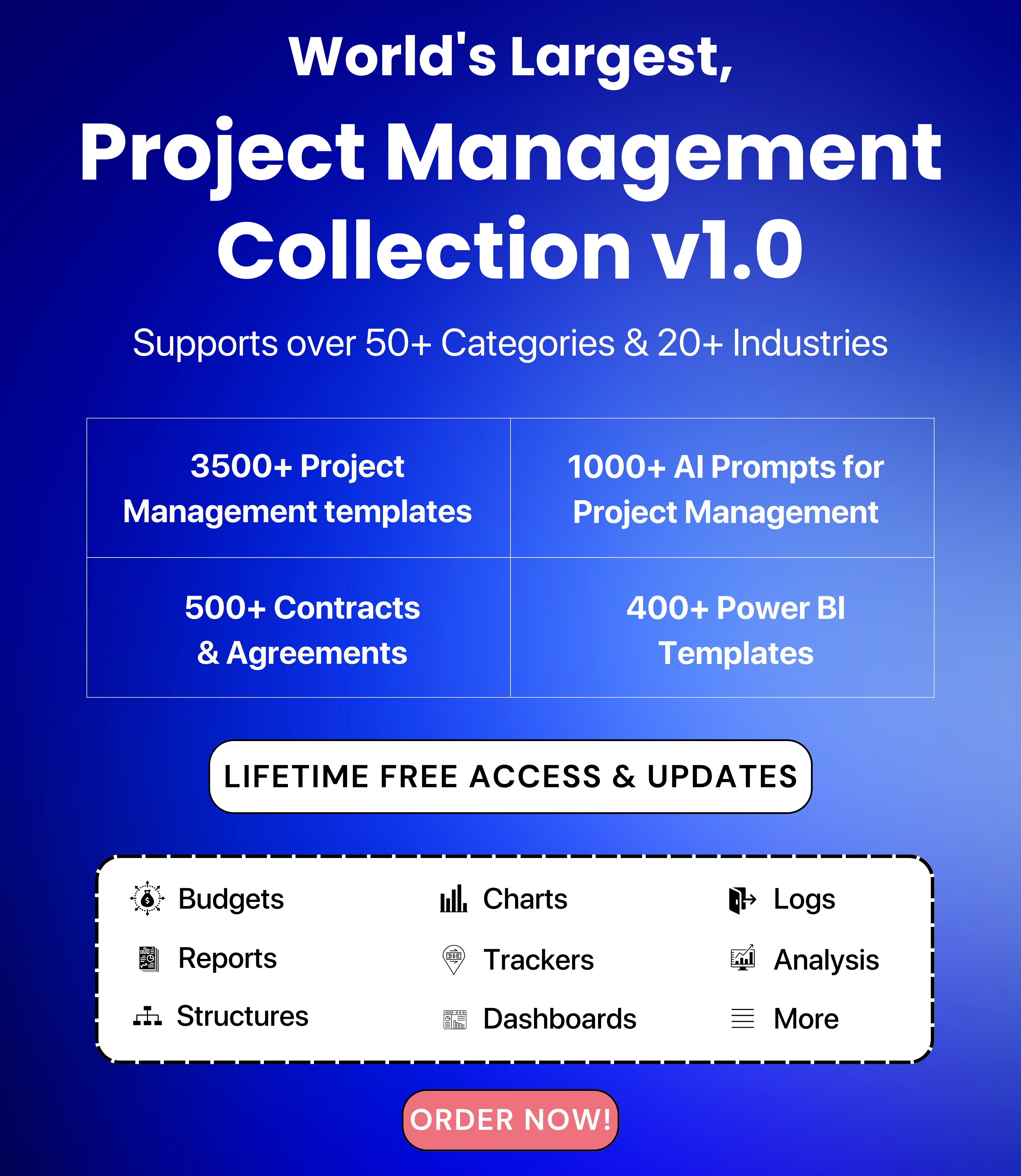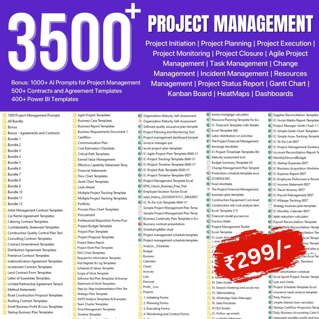 Introducing PROJECT MANAGEMENT COLLECTION V1.0, a comprehensive bundle designed to revolutionize your project management approach! With over 3500 meticulously crafted templates and 1000 advanced AI prompts, this collection covers 50+ categories and 20+ industries, making it the ultimate solution for all your project management needs.